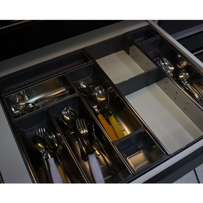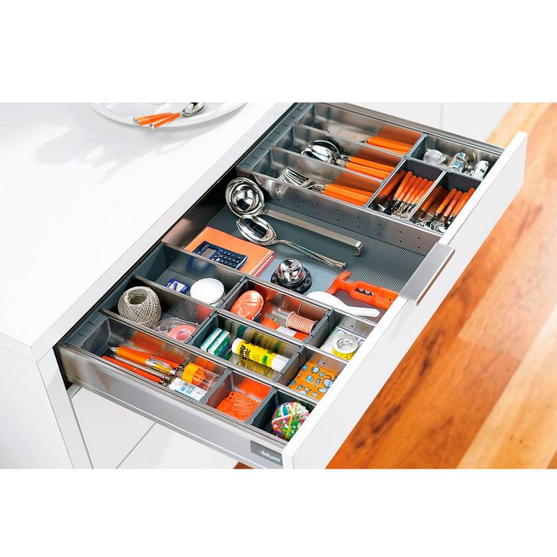 A linha ORGA-LINE da Blum redefine a organização interna de gavetas e extensões, oferecendo uma solução sofisticada e altamente flexível para cozinhas e outros ambientes. Com um design elegante e funcional, este sistema de divisões internas é composto por cubas de aço inox de alta qualidade, resistentes à lava-louças, e divisores longitudinais e transversais que podem ser ajustados conforme a necessidade, garantindo que cada utensílio, condimento ou objeto tenha seu lugar específico. ORGA-LINE é compatível com os sistemas de gavetas TANDEMBOX, MOVENTO e TANDEM, proporcionando uma visibilidade clara e acesso facilitado a todos os itens armazenados. Além da organização impecável, a linha ORGA-LINE inclui auxiliares de cozinha práticos, como cortadores de filme PVC e papel alumínio, porta-facas e porta-condimentos, que complementam a funcionalidade e otimizam o aproveitamento do espaço. A instalação é simples e não requer ferramentas, permitindo uma personalização rápida e eficiente do interior dos móveis, transformando a rotina diária com praticidade e um toque de requinte.