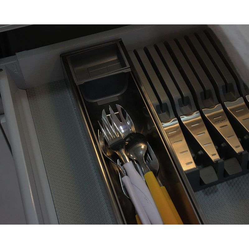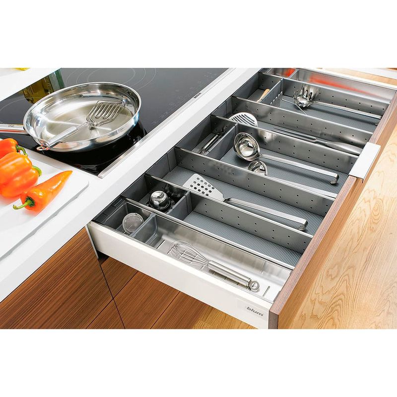 As estruturas divisórias da linha ORGA-LINE da Blum são a essência da organização inteligente para gavetas e extensões, projetadas para oferecer máxima flexibilidade e aproveitamento de espaço. Fabricadas com materiais de alta qualidade, como o aço inox, estas divisórias garantem durabilidade e um visual sofisticado ao interior dos móveis. O sistema é composto por divisores longitudinais e transversais que podem ser combinados e ajustados de inúmeras maneiras, adaptando-se perfeitamente ao tamanho e formato dos itens a serem armazenados, desde talheres e utensílios de cozinha até material de escritório e objetos pessoais. A principal característica destas estruturas é a sua capacidade de criar compartimentos personalizados, assegurando que cada objeto tenha seu lugar definido, o que facilita a visualização e o acesso rápido. São compatíveis com os sistemas de gavetas TANDEMBOX, MOVENTO e TANDEM da Blum, integrando-se de forma harmoniosa e funcional. A instalação é intuitiva e não requer ferramentas, permitindo que o usuário configure e reconfigure a organização interna conforme suas necessidades evoluem, proporcionando uma solução de organização dinâmica e eficiente para cozinhas, banheiros, escritórios e qualquer outro ambiente que demande ordem e praticidade.