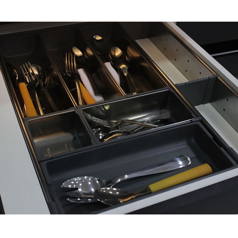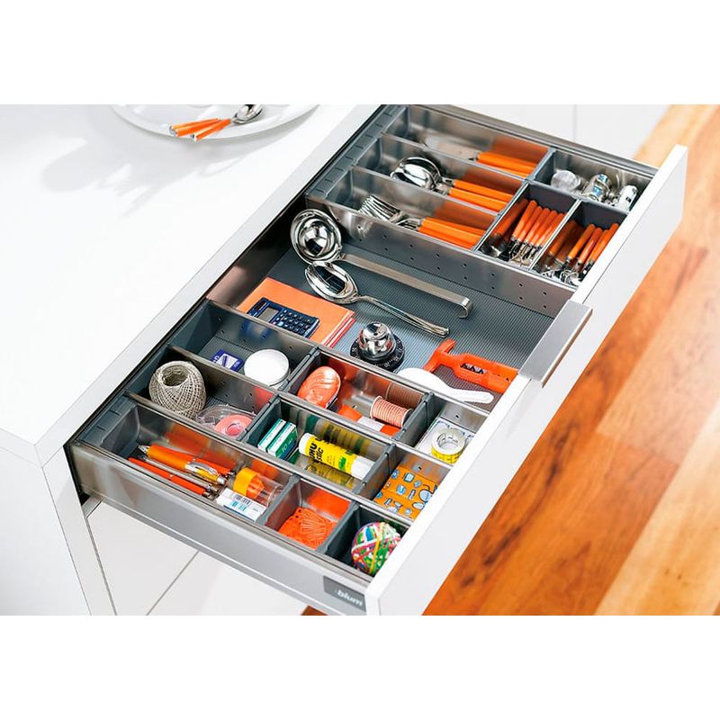 A linha ORGA-LINE da Blum redefine a organização interna de gavetas e extensões, oferecendo uma solução sofisticada e altamente flexível para cozinhas e outros ambientes. Com um design elegante e funcional, este sistema de divisões internas é composto por cubas de aço inox de alta qualidade, resistentes à lava-louças, e divisores longitudinais e transversais que podem ser ajustados conforme a necessidade, garantindo que cada utensílio, condimento ou objeto tenha seu lugar específico. ORGA-LINE é compatível com os sistemas de gavetas TANDEMBOX, MOVENTO e TANDEM, proporcionando uma visibilidade clara e acesso facilitado a todos os itens armazenados. Além da organização impecável, a linha ORGA-LINE inclui auxiliares de cozinha práticos, como cortadores de filme PVC e papel alumínio, porta-facas e porta-condimentos, que complementam a funcionalidade e otimizam o aproveitamento do espaço. A instalação é simples e não requer ferramentas, permitindo uma personalização rápida e eficiente do interior dos móveis, transformando a rotina diária com praticidade e um toque de requinte.