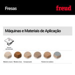 As fresas Freud da linha 04 são fresas retas paralelas para cortes em madeira dura, madeira macia, MDF, MDP, compensado e acrílico, e são capazes de deixar um excelente acabamento com apenas uma passada. Por serem feitas inteiramente de Carbide, o metal mais duro do mercado, são altamente resistentes à quebra quando utilizadas corretamente. Essas fresas de haste de 6mm (ou ¼”) devem ser usadas em máquinas com um número de RPM (rotações por minuto) de até 24.000 para assim evitar riscos de quebra ou comprometimento do acabamento. São compatíveis com tupias manuais, tupias de coluna, routers e máquinas CNC. Alguns modelos contam com calçadas de widea de dois cortes e revestimento Perma-SHIELD em sua parte superior, responsável por isolar termicamente a fresa, evitar o superaquecimento para prolongar a vida útil, reduzir o acúmulo de resina para um número menor de paradas para limpeza da ferramenta, e permitir que a ferramenta gire livremente, reduzindo assim a tensão no motor da máquina para prolongar a durabilidade do equipamento.