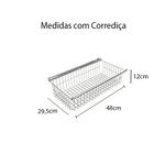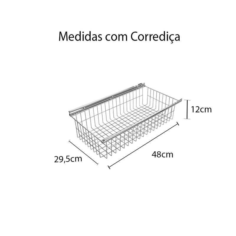 Sistema de gaveta aramada completa, modelo M20, com cesto em arame de aço com acabamento cromado e par de corrediças. Dimensões do cesto: 245mm (Largura) x 480mm (Profundidade) x 120mm (Altura). O acabamento cromado oferece maior resistência e estética moderna. Corrediças asseguram deslizamento suave e acesso total ao conteúdo. Adequada para closets, cozinhas e outros móveis.
