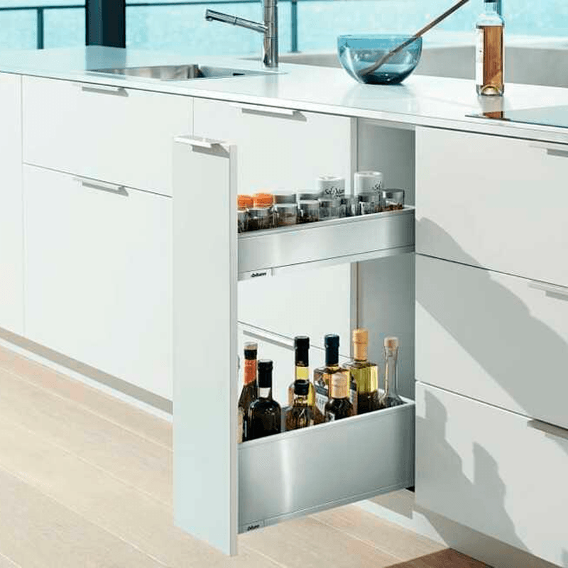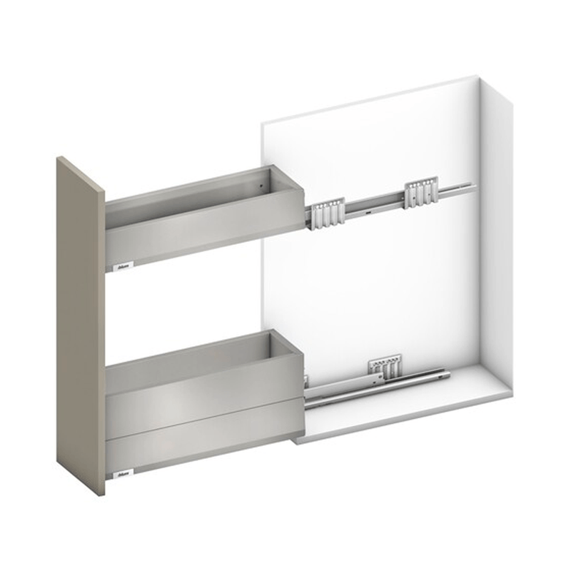 O Kit para Gabinete Porta Tempero Blumotion Space Twin da Blum (referência Varotti, por exemplo, 770X45S0S para 450mm Cinza Orion) é uma solução para armários estreitos, otimizando o aproveitamento de espaço. Utiliza corrediças com deslocamento diagonal para maior estabilidade lateral e suporta uma capacidade de carga de até 20kg. O sistema conta com a tecnologia BLUMOTION para fechamento leve e silencioso e permite extração total, facilitando o acesso aos itens armazenados. É compatível com sistemas box como LEGRABOX, MERIVOBOX e TANDEMBOX, ou com o sistema de corrediças MOVENTO, permitindo uma aparência uniforme no mobiliário. Projetado para módulos estreitos (ex: 170mm), é fabricado em aço e possui ajuste tridimensional. Ideal para cozinhas que buscam funcionalidade e design sofisticado.