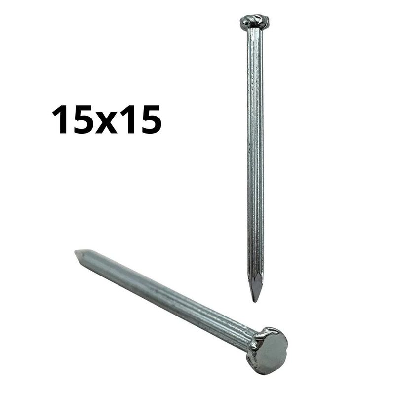 Prego de aço modelo 15 x 15, com corpo curto e fino, superfície metálica lisa e acabamento comum; possui cabeça pequena para aplicação discreta e ponta bem afiada que facilita a penetração em madeira e materiais leves. Indicado para fixações simples e de pequeno porte.