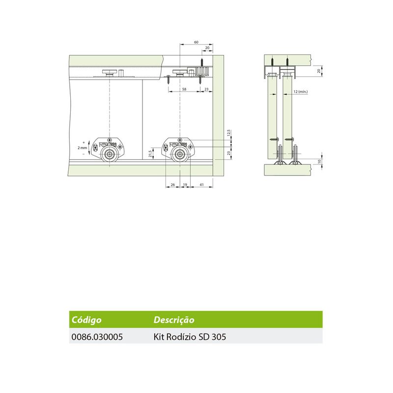 Com opção de fixação através de parafusos cabeça panela autocortante PHS 3,5x14mm e PHS 4x25mm, o Rodízio SD305 suporta até 30 kg por porta, sendo ideal para portas deslizantes de diversos tamanhos e pesos. Além disso, sua capacidade de regulagem de ±2 mm permite um ajuste preciso e fácil durante a instalação.