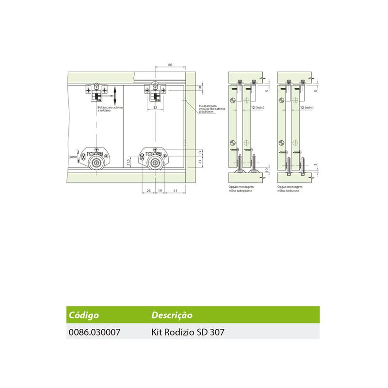 Com opção de fixação através de parafusos cabeça panela autocortante PHS 3,5x14 mm e parafusos cabeça chata autocortante PHS 3,5x12 mm, o Rodízio SD307 suporta até 30 kg por porta, sendo ideal para portas deslizantes de diversos tamanhos e pesos. Além disso, sua capacidade de regulagem de ±2 mm permite um ajuste preciso e fácil durante a instalação.
